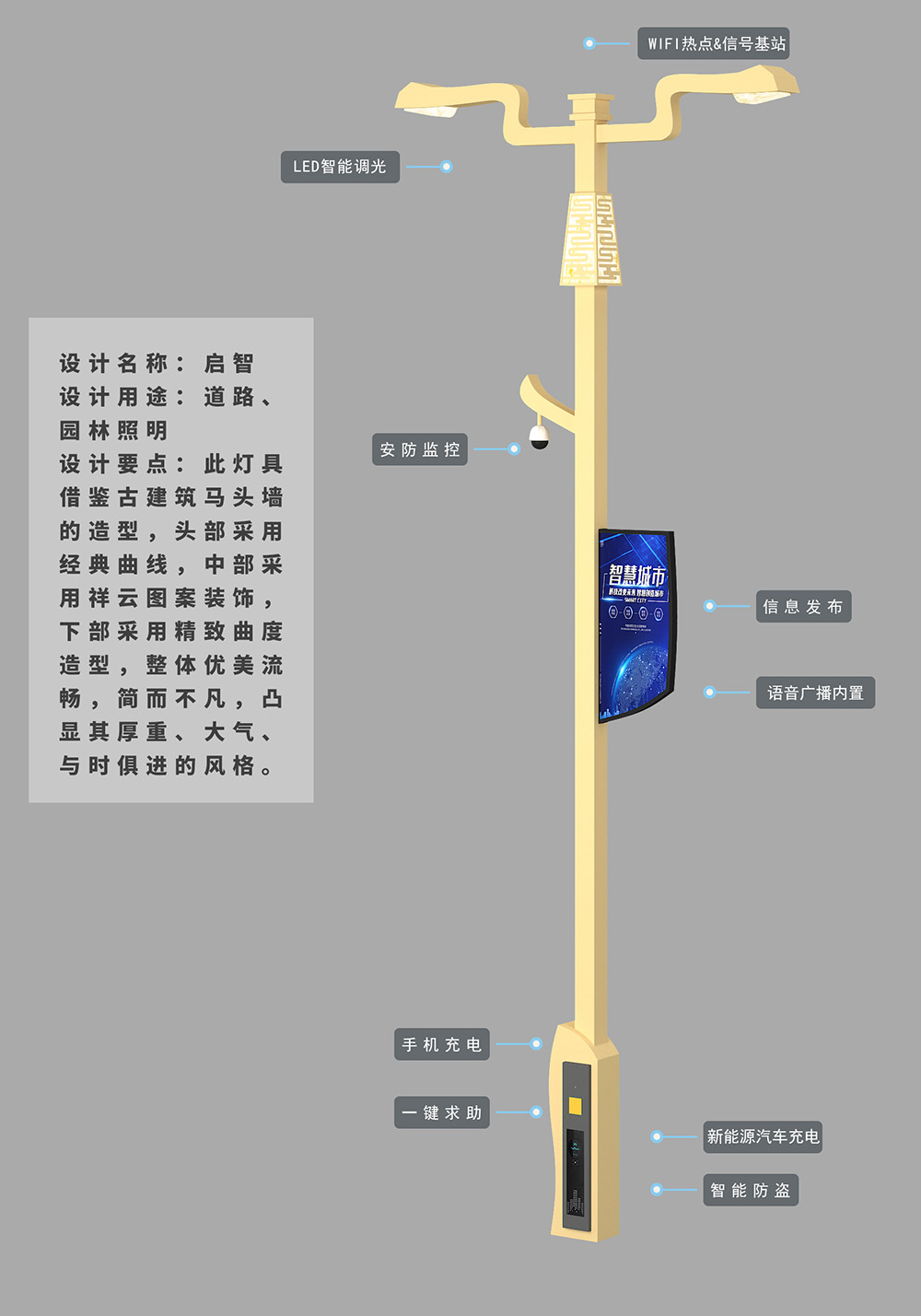 設計要點:此燈具借鑒古建筑馬頭墻的造型,頭部采用經典曲線,中部采用祥云圖案裝飾,下部采用精致曲度造型,整體優(yōu)美流暢,簡而不凡,凸顯其厚重、大氣、與時俱進的風格。